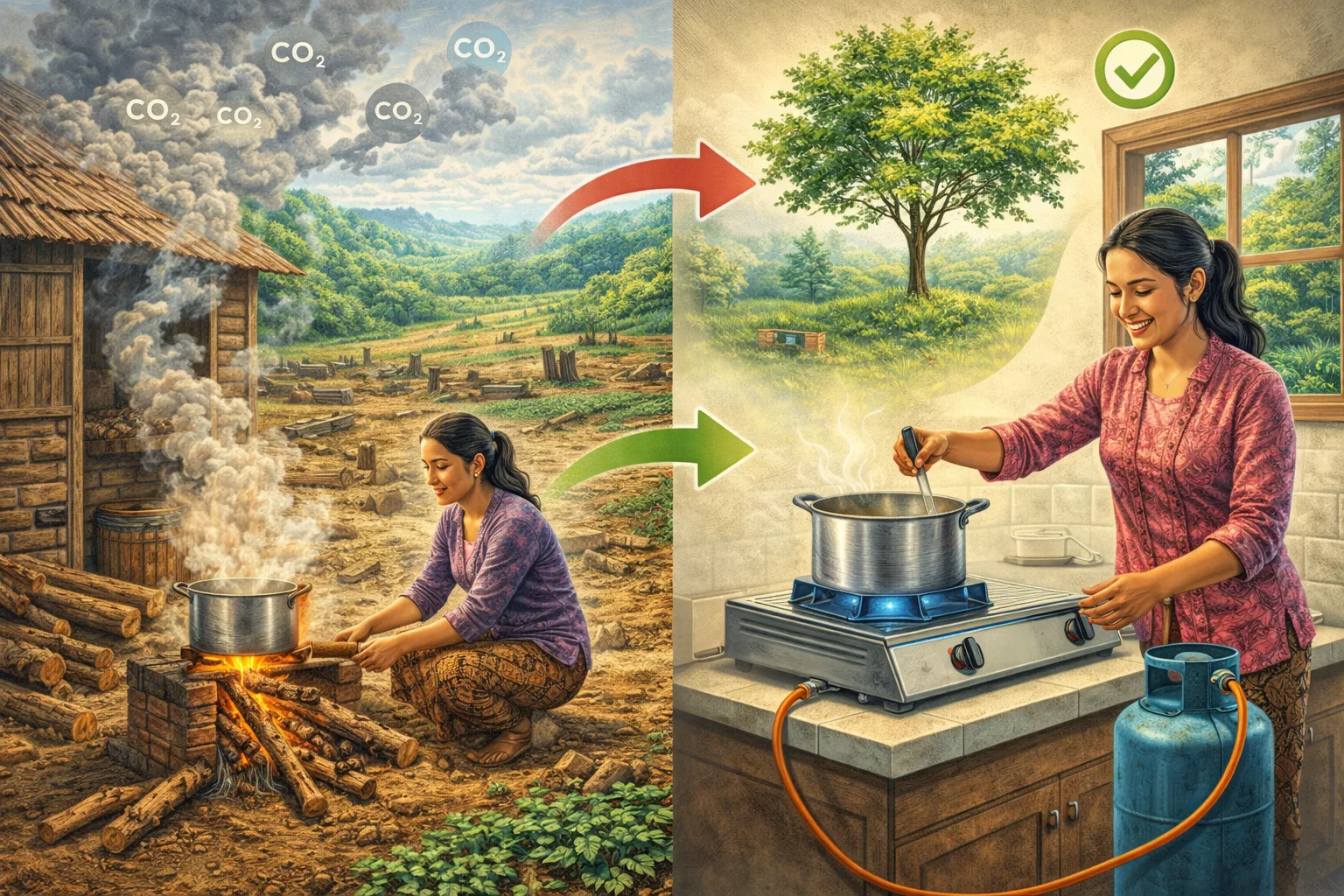 Mengganti kompor pembakaran kayu mengurangi deforestasi dan emisi.