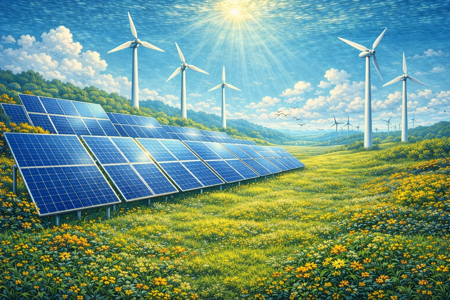 Solar and wind power replace fossil fuels, reducing greenhouse gas emissions.